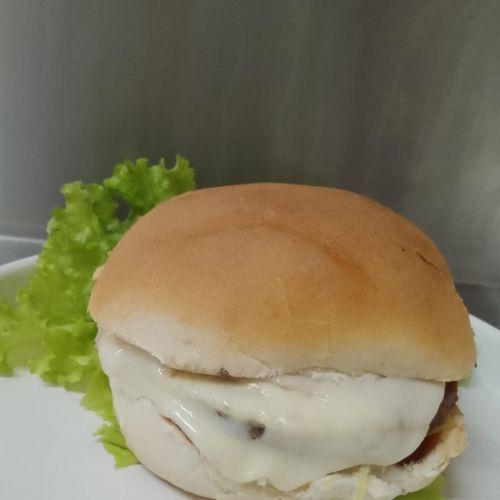 Hambúrguer caseiro, queijo, tomate e maionese caseira.