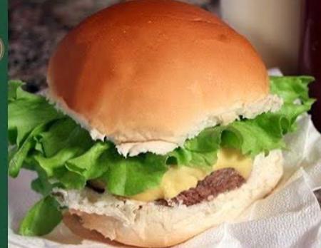 Hambúrguer caseiro, queijo, tomate, alface e maionese caseira.