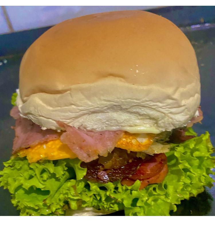 Hambúrguer caseiro, bacon, calabresa, ovo, presunto, queijo, alface, tomate e maionese caseira.