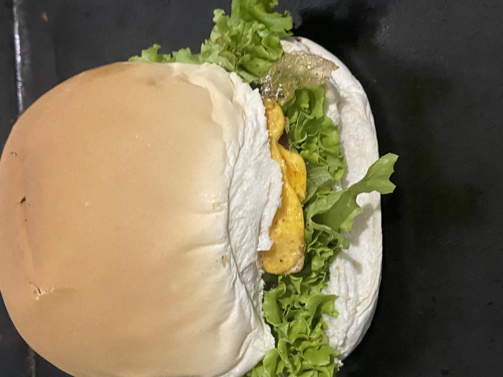 Hambúrguer caseiro, ovo, queijo, alface, tomate e maionese caseira.
