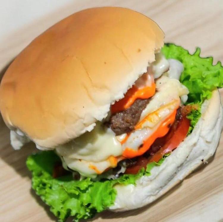 2 Hambúrgueres, cheddar, queijo, cebola roxa, alface, tomate e maionese caseira.