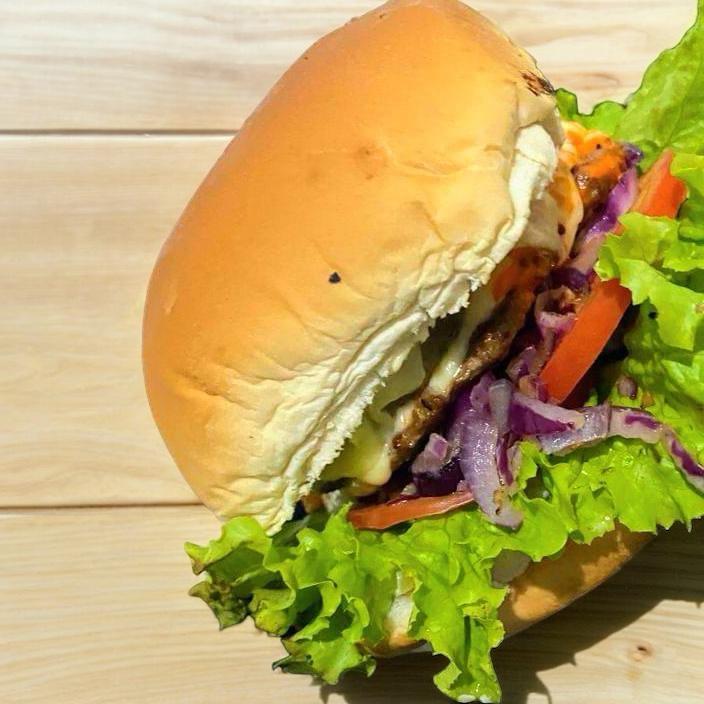 Hambúrguer caseiro, queijo, bacon, cebola roxa, barbecue, alface, tomate e maionese caseira.