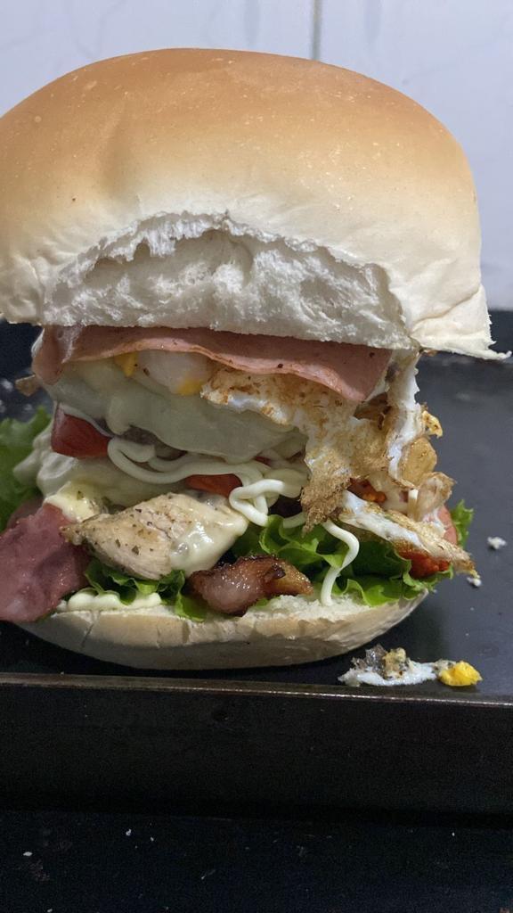 Hambúrguer caseiro, salsicha, frango grelhado, catupiry, bacon, calabresa, ovo, presunto, alface, tomate e maionese caseira.