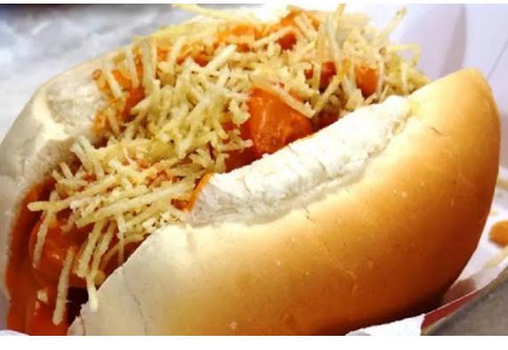 1 Salsicha, carne moiada, ketchup, mostarda, e batata palha.