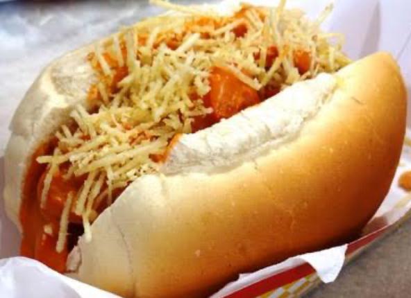 2 Salsichas, carne moiada, ketchup, mostarda, e batata palha.