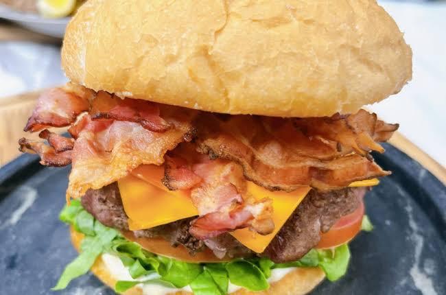 Hambúrguer caseiro ,Bacon, Cheddar fatias, Alface e tomate e maionese caseira